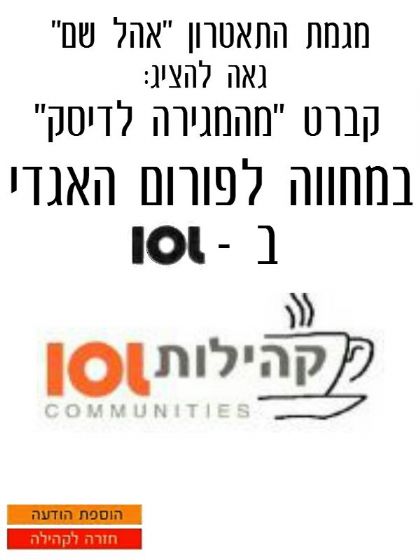 בתאריכים 10-11/4/2013 עלה קברט "מהמגירה לדיסק" בתיכון "אהל שם", רמת גן, בביצוע תלמידי מגמת התיאטרון.
